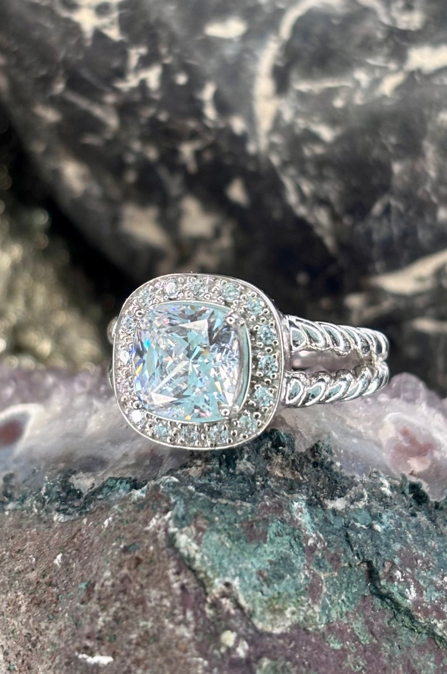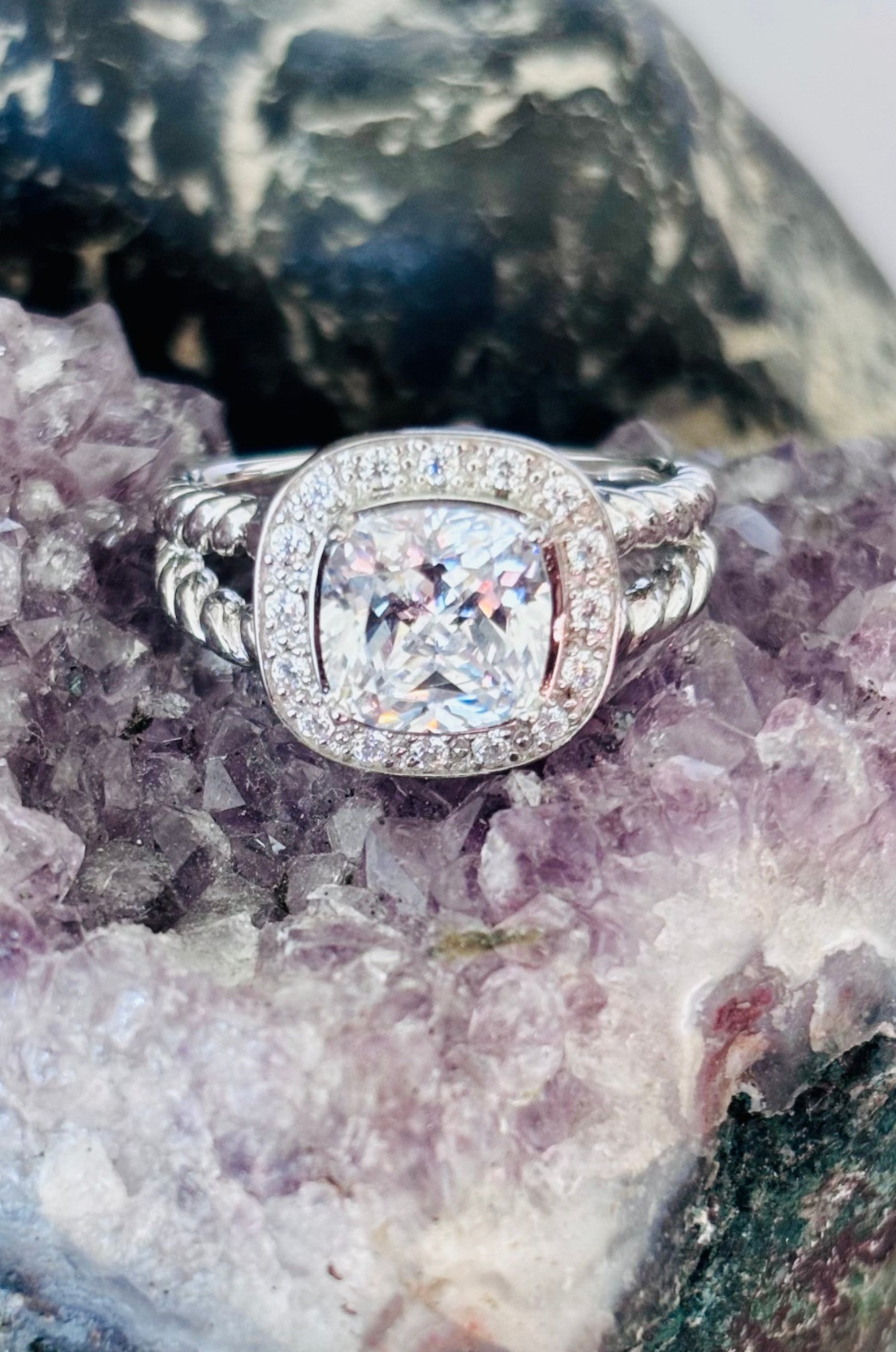 Anillo con zirconitas corte cushion y diamante en plata 925