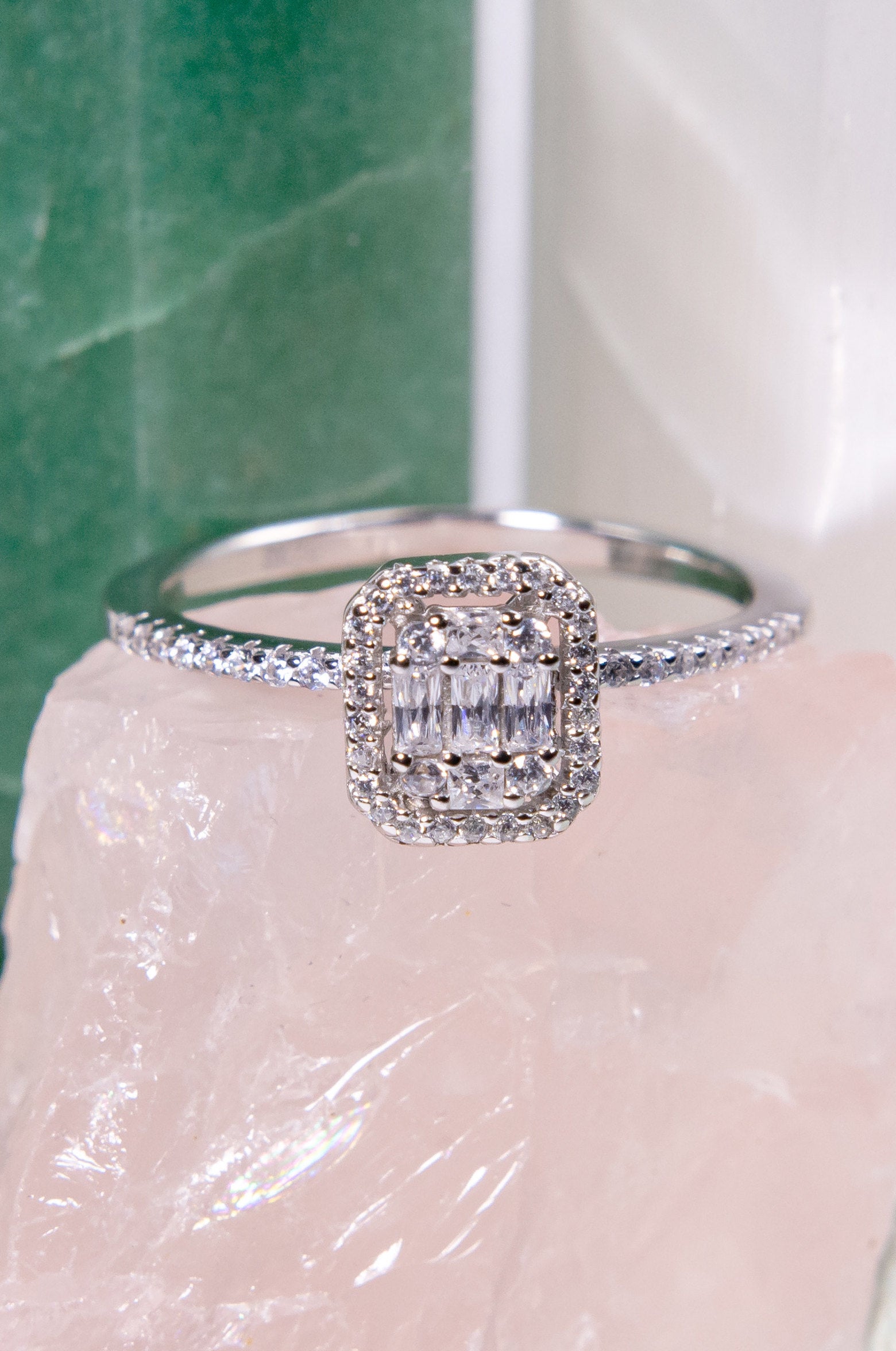Anillo halo con zirconitas en corte baguette y corte diamante en plata 925