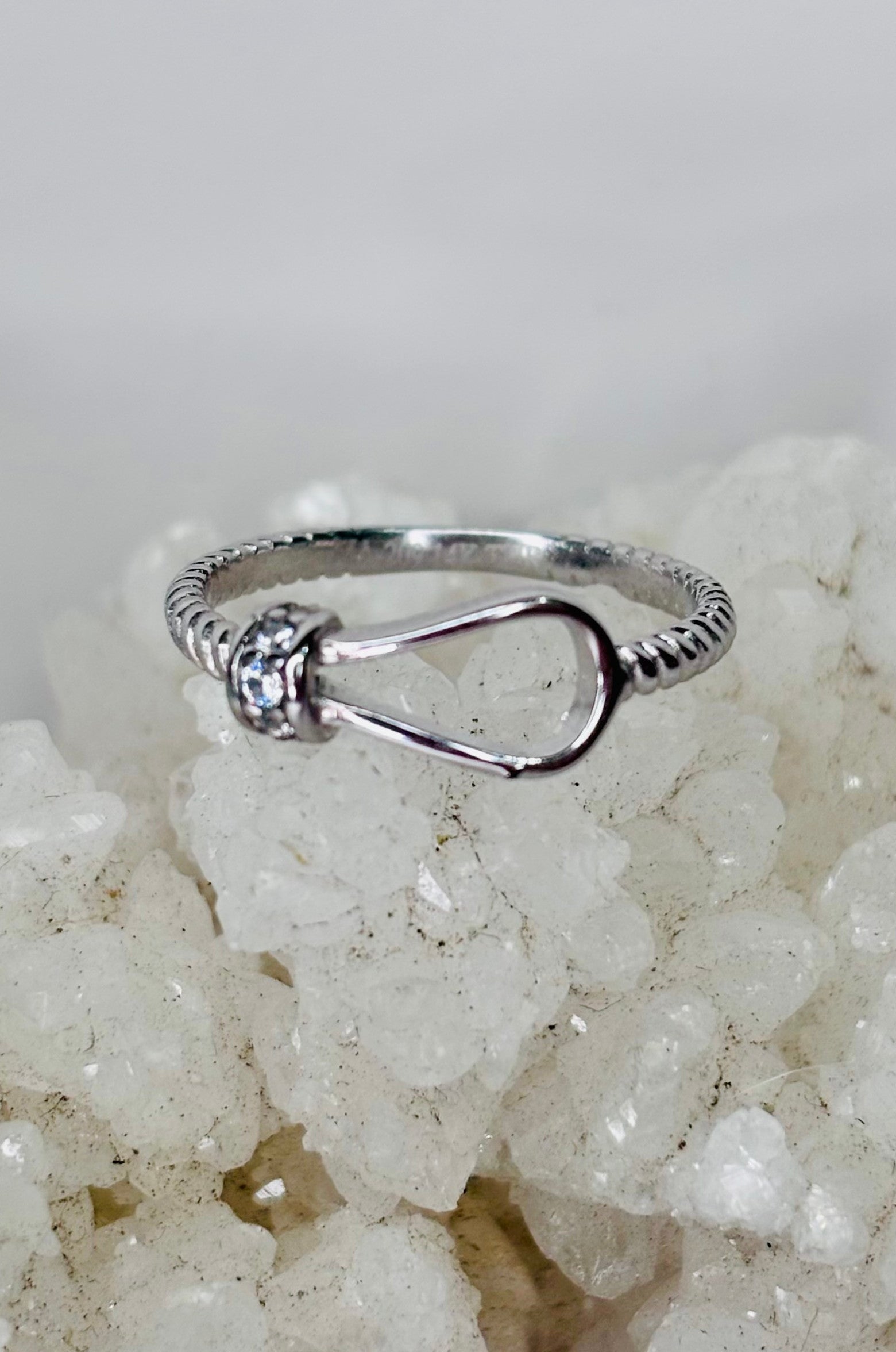 Simboliza un vínculo eterno con este anillo lazo en oro blanco 14k, donde el delicado nudo de zirconitas blancas en corte diamante brilla con una luminosidad pura que contrasta elegantemente con la frialdad plateada del metal, creando una pieza que captura la esencia de las conexiones perdurables y el amor infinito en un diseño tan refinado como cargado de significado.