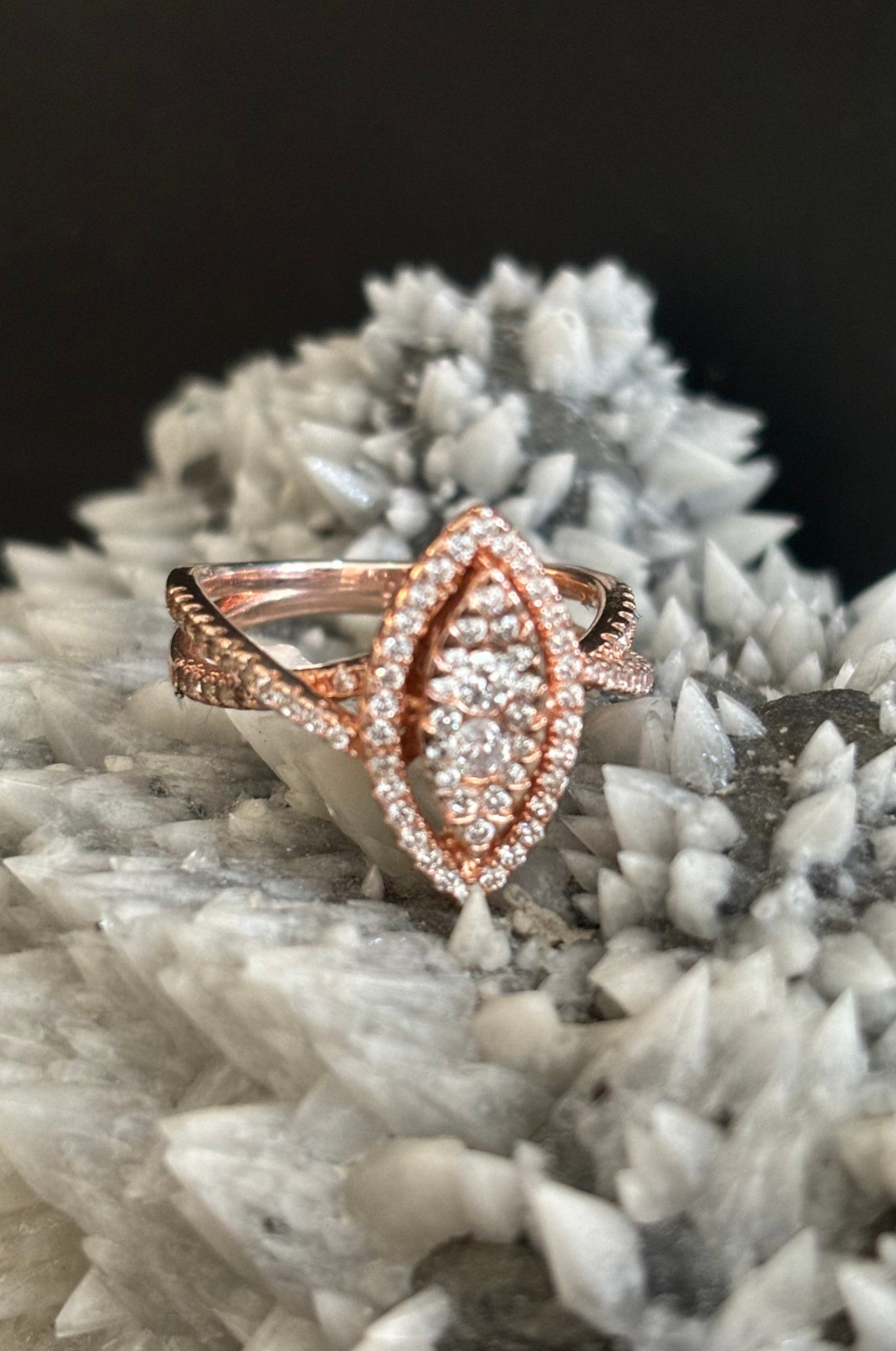 Anillo marquesa con zirconitas en corte diamante en plata rosa 925