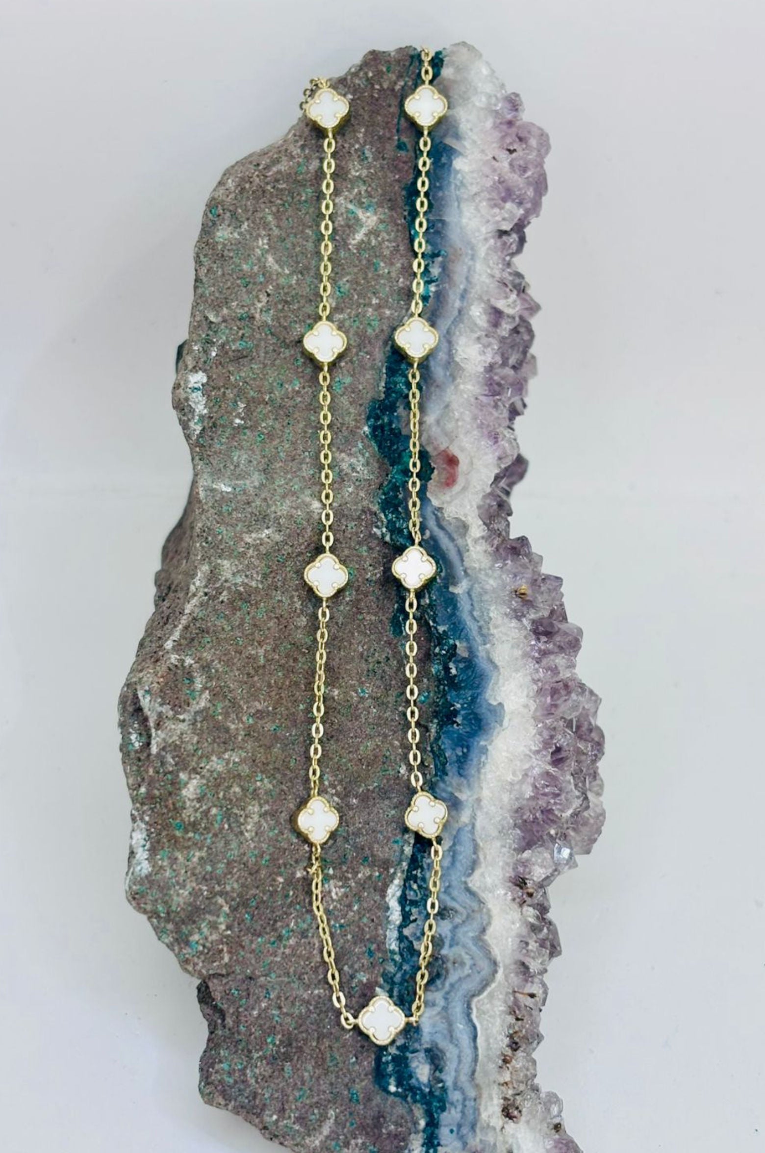 Realza tu elegancia con este collar de oro italiano de 10 kilates, compuesto por delicados mini tréboles blancos que reflejan pureza y sofisticación. su diseño sutil y luminoso aporta un toque de frescura que complementa tanto atuendos casuales como formales.