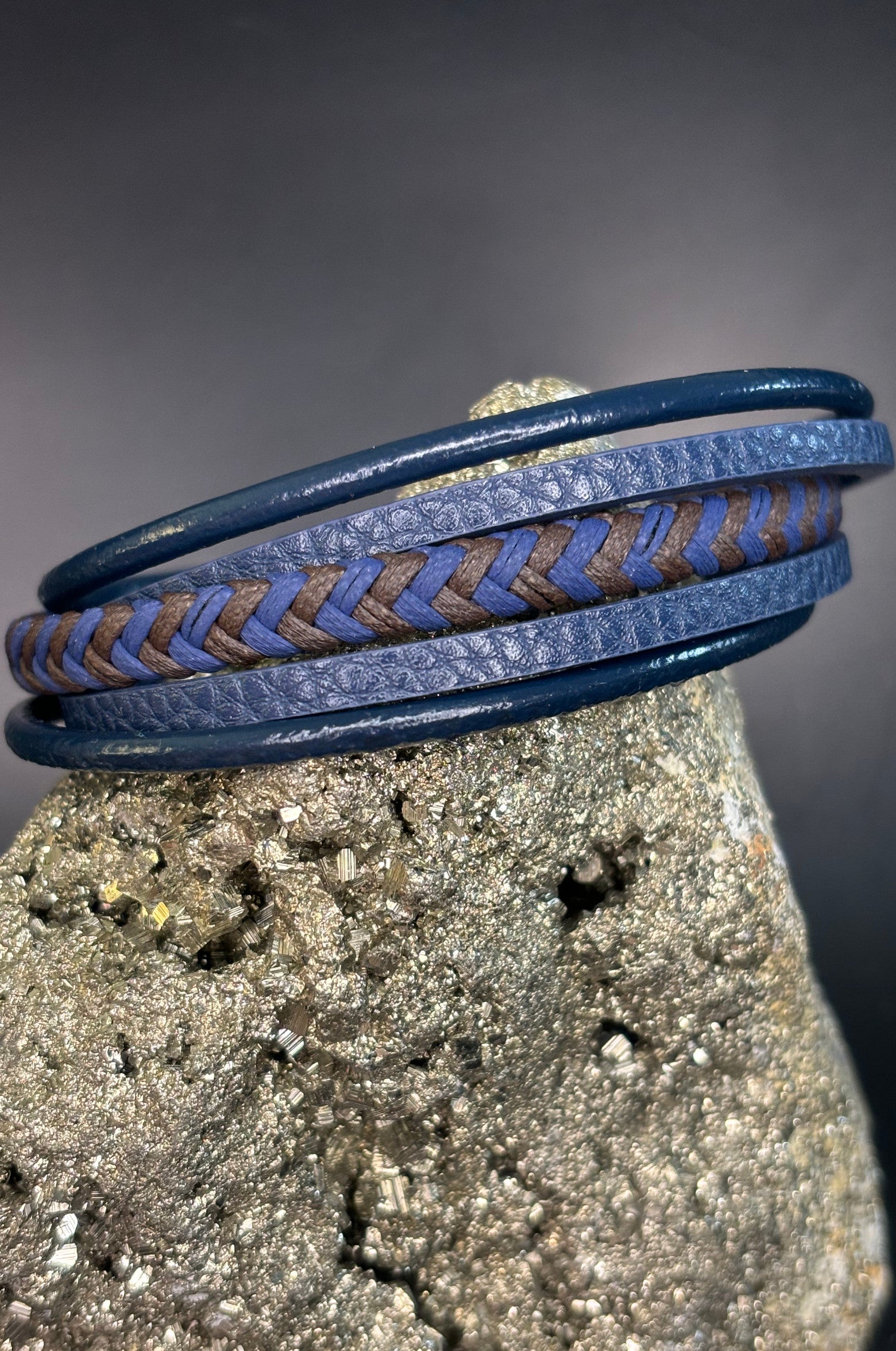Descubre la elegancia y el estilo de nuestra pulsera de piel azul con café de 5 tiras, con cerradura negra magnética. Este accesorio único combina la suavidad de la piel en dos tonos, azul y café, creando un diseño trenzado que aporta textura y profundidad. Las cinco tiras se entrelazan de manera armoniosa, ofreciendo un look moderno y atractivo.
