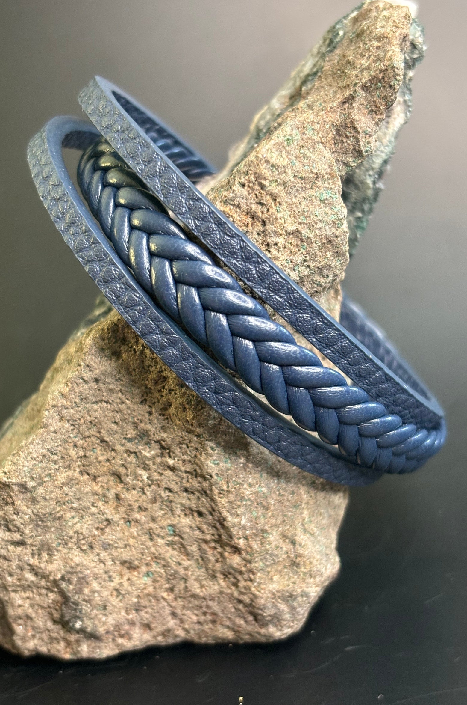 Descubre la sofisticación de nuestra pulsera de piel azul trenzada de 3 tiras, con cerradura negra magnética. Este elegante accesorio destaca por su diseño moderno y atractivo, que combina la suavidad de la piel azul con un trenzado de tres tiras que le da un toque único y dinámico.