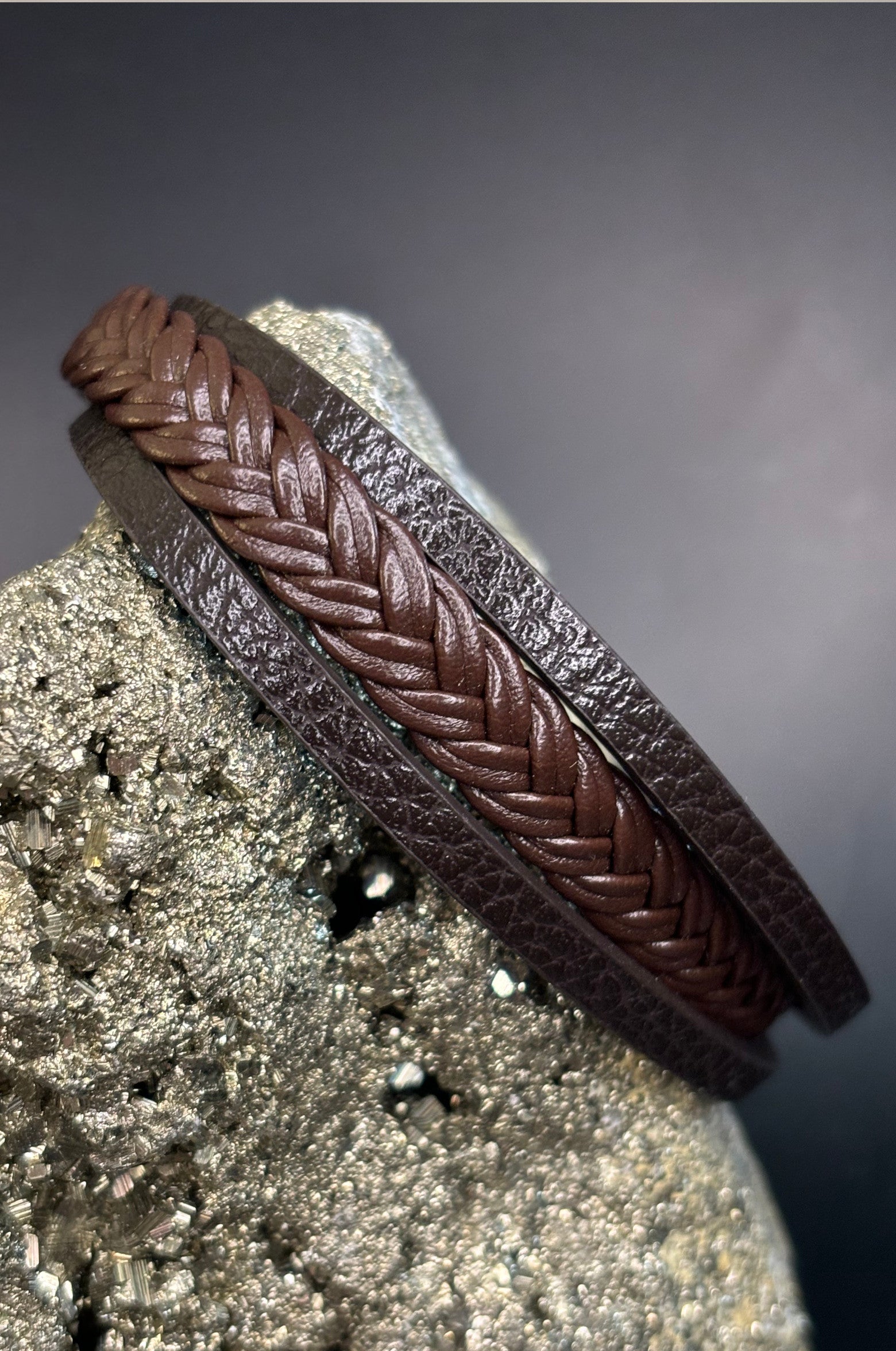 Descubre la calidez y el estilo de nuestra pulsera de piel café trenzada de 3 tiras, con cerradura negra magnética, 21.5cm de largo. Este elegante accesorio destaca por su diseño trenzado de tres tiras, que combina la suavidad de la piel café con un toque moderno y atractivo.