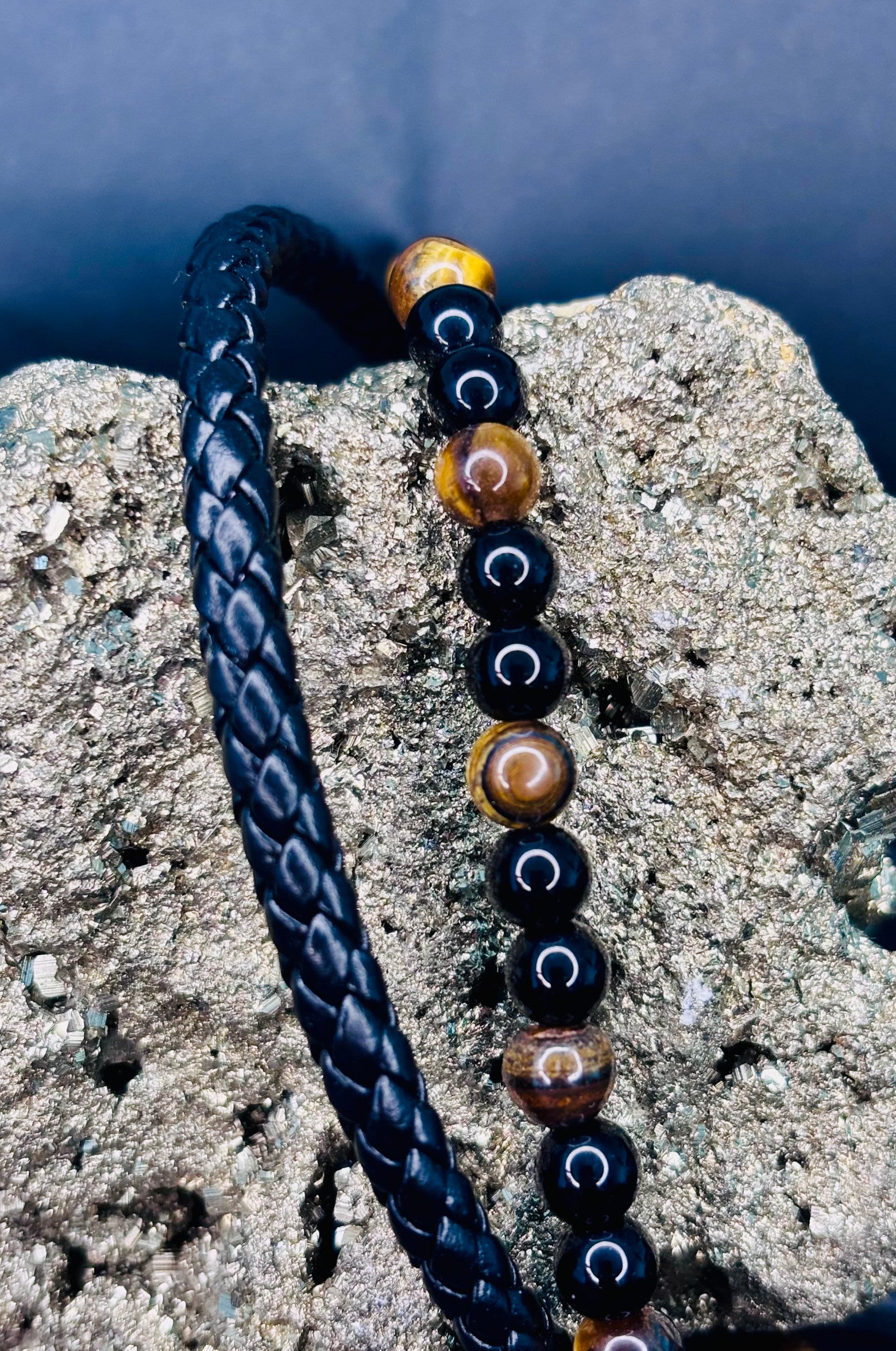Descubre la elegancia y el poder de nuestra pulsera de piel negra de 2 tiras con ojo de tigre y cerradura negra magnética, 22cm de largo. Este accesorio combina la suavidad de la piel negra con un diseño de dos tiras, realzado por la presencia de una piedra de ojo de tigre, que simboliza fuerza y protección.