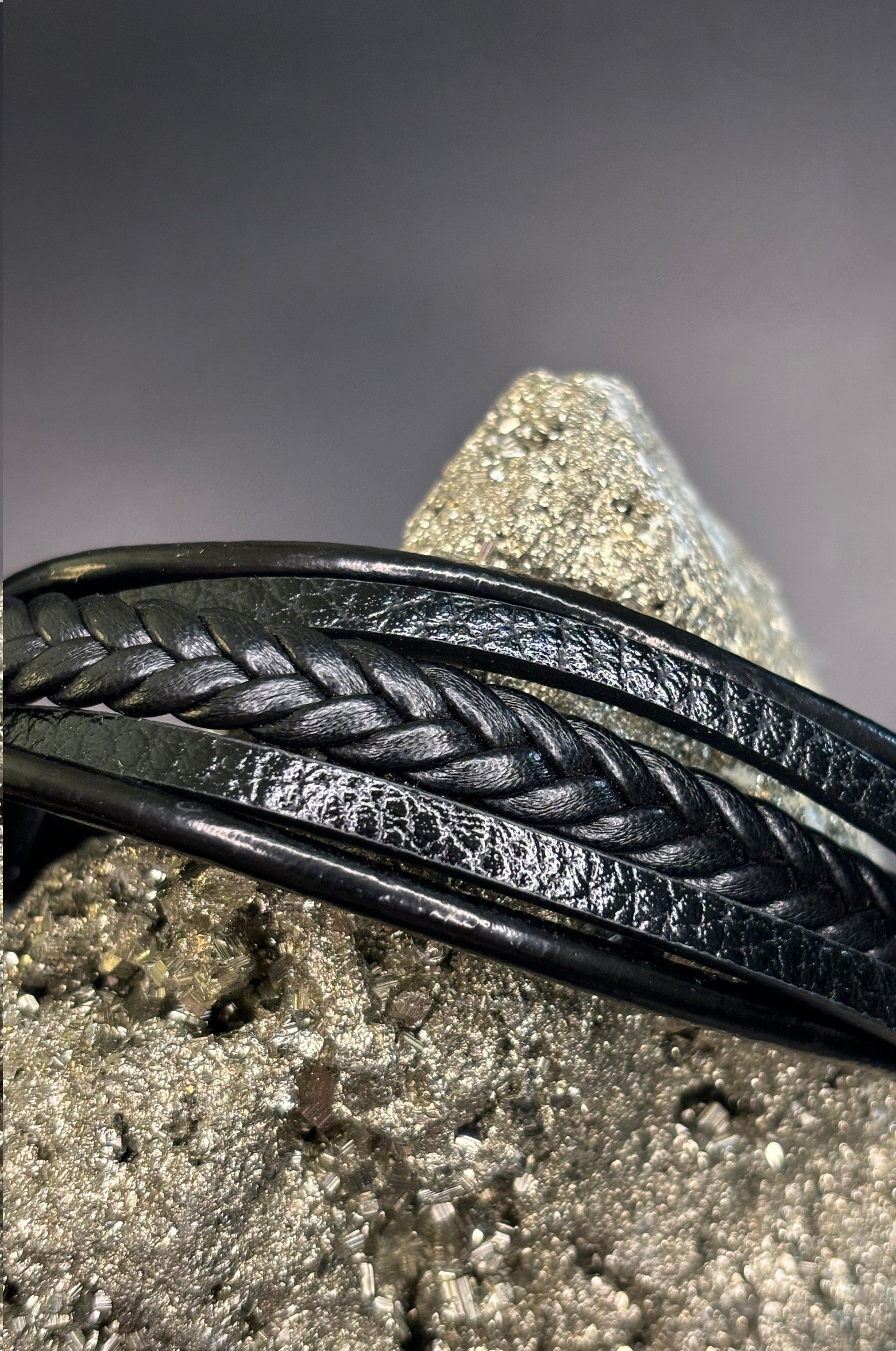 Descubre la sofisticación de nuestra pulsera de piel negra trenzada de 5 tiras, con cerradura negra magnética, 21.5cm de largo. Este accesorio elegante combina la suavidad de la piel negra con un diseño trenzado de cinco tiras, creando una pieza única que destaca por su estilo moderno y atractivo.